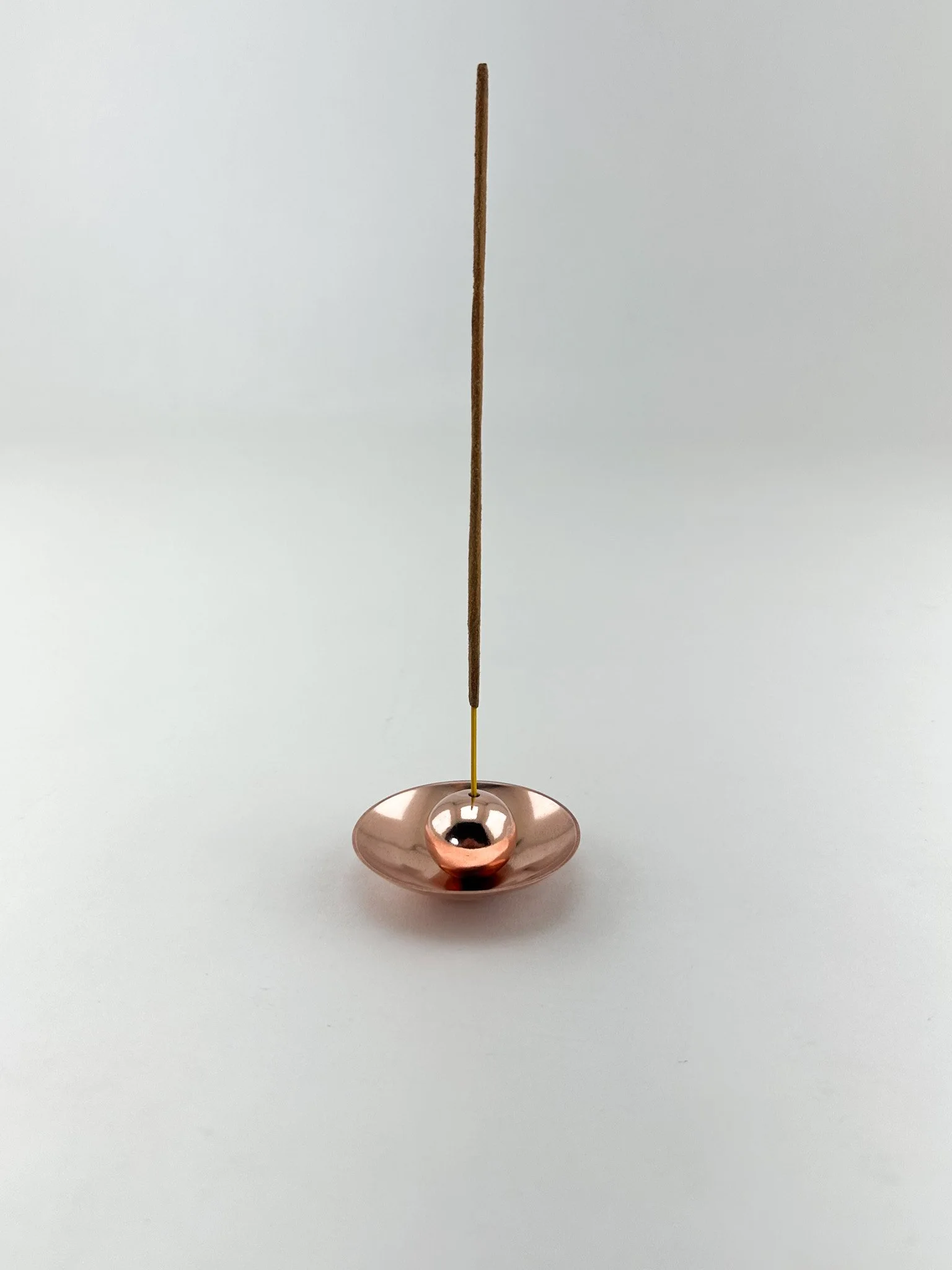 This piece represents balance in both form and function. Filled with steel shot, the sphere is bottom-heavy and will always return to its center of gravity. The tray serves a nest, supporting the sphere’s vertical stature and catching the fallen ash from the incense stick.