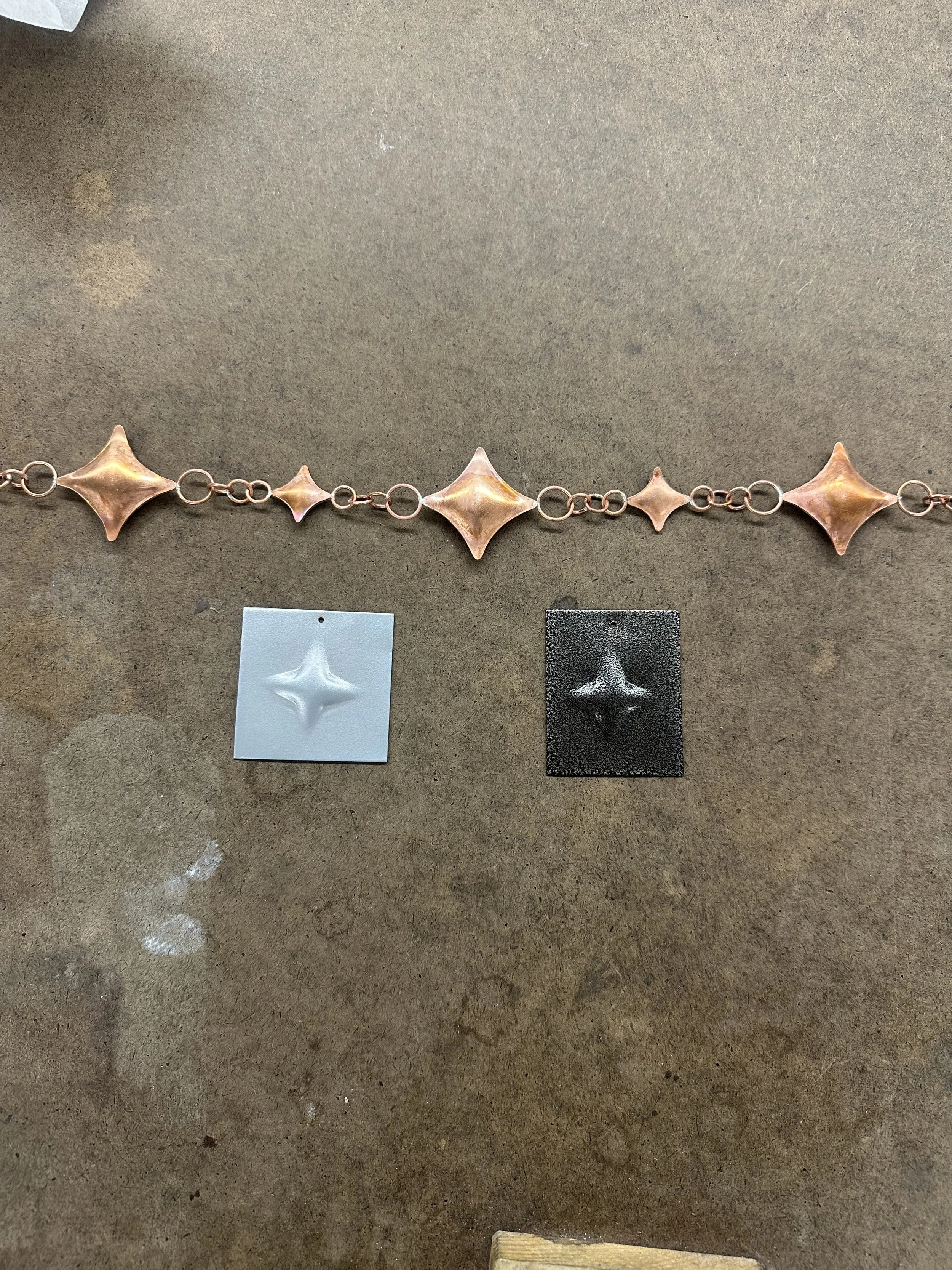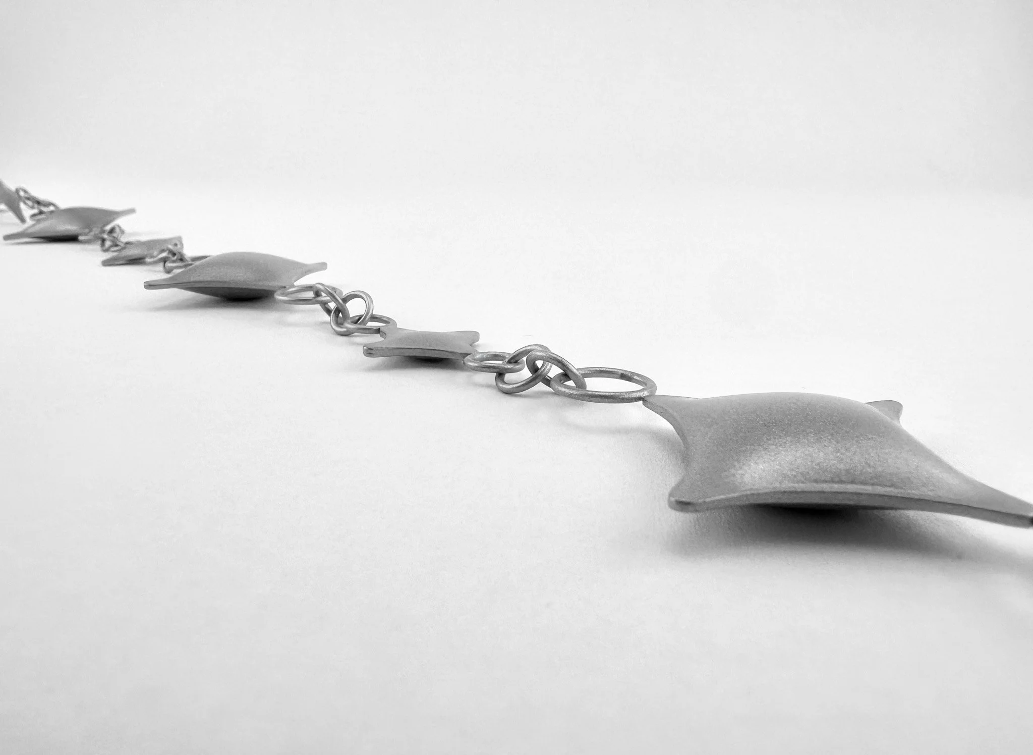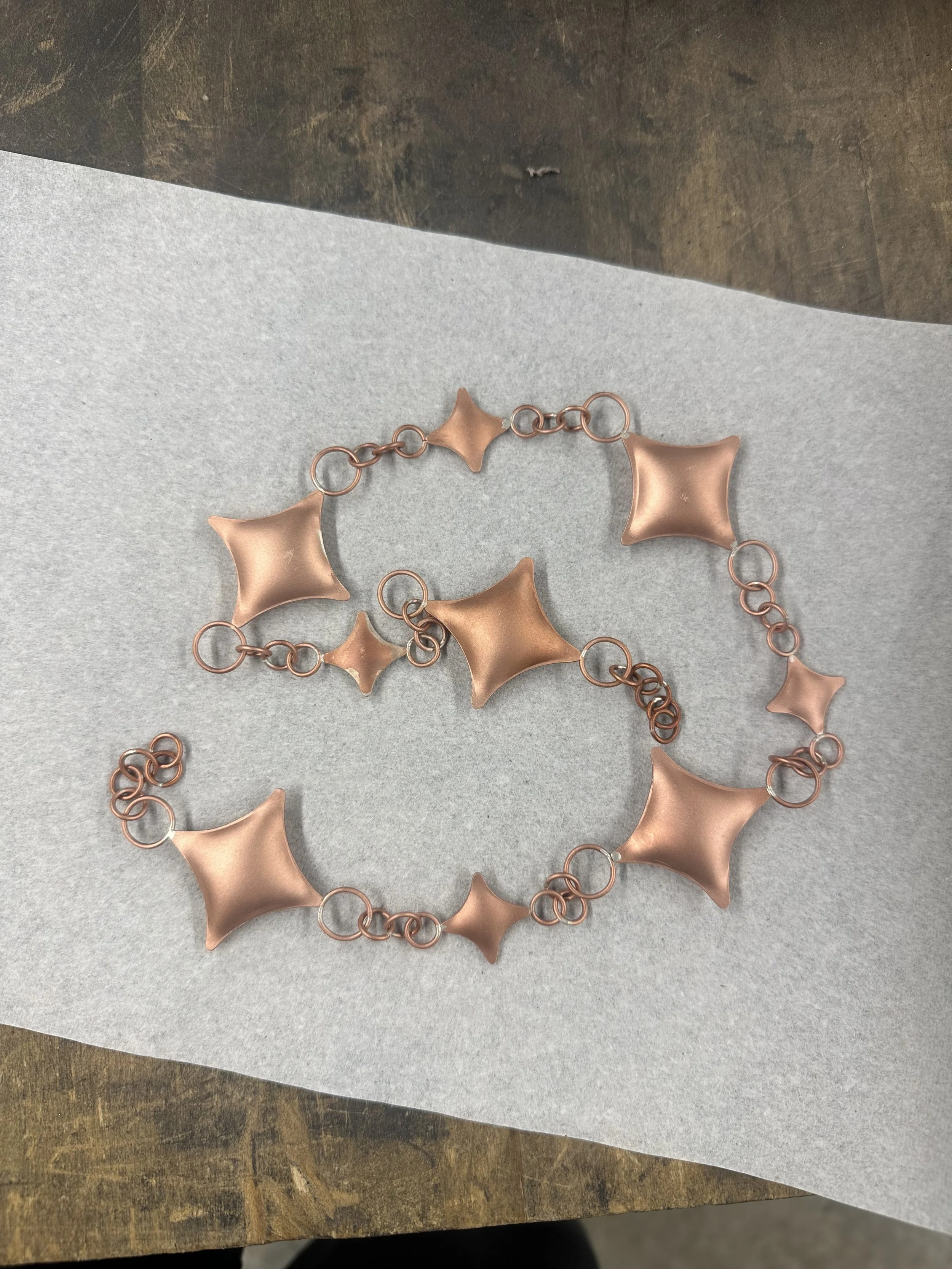 Inspired by the jewelry that I interact with through my experience as a celebrity stylist, this wallet chain aims to reflect technical consistency and intricate precision. Made entirely from copper, both sheet and wire, the chain is equipped with a platinum powder-coating which gives the surface a satin sheen. Though fully functional, this piece remains largely experimental and offers a solid foundation for further exploration.