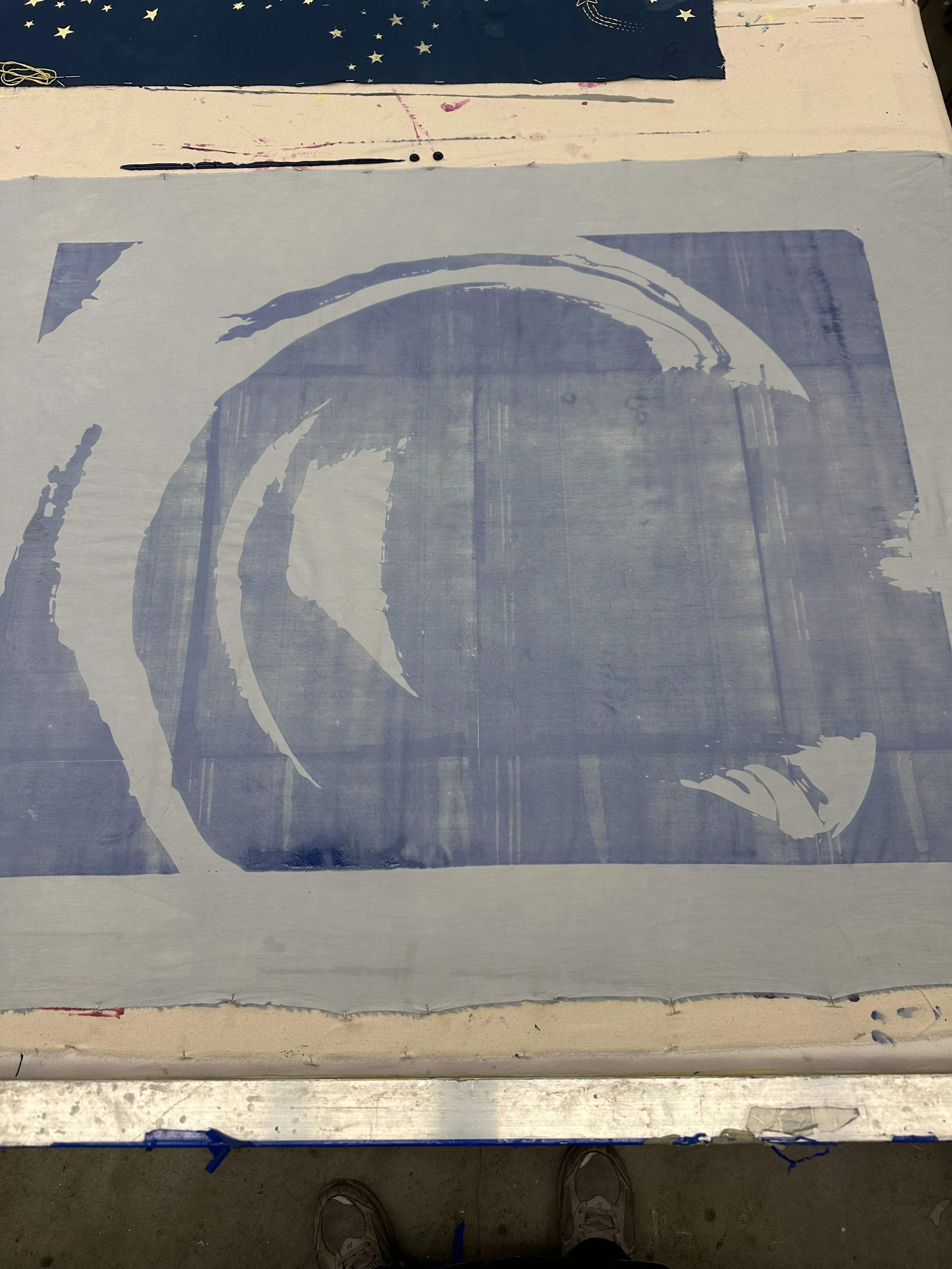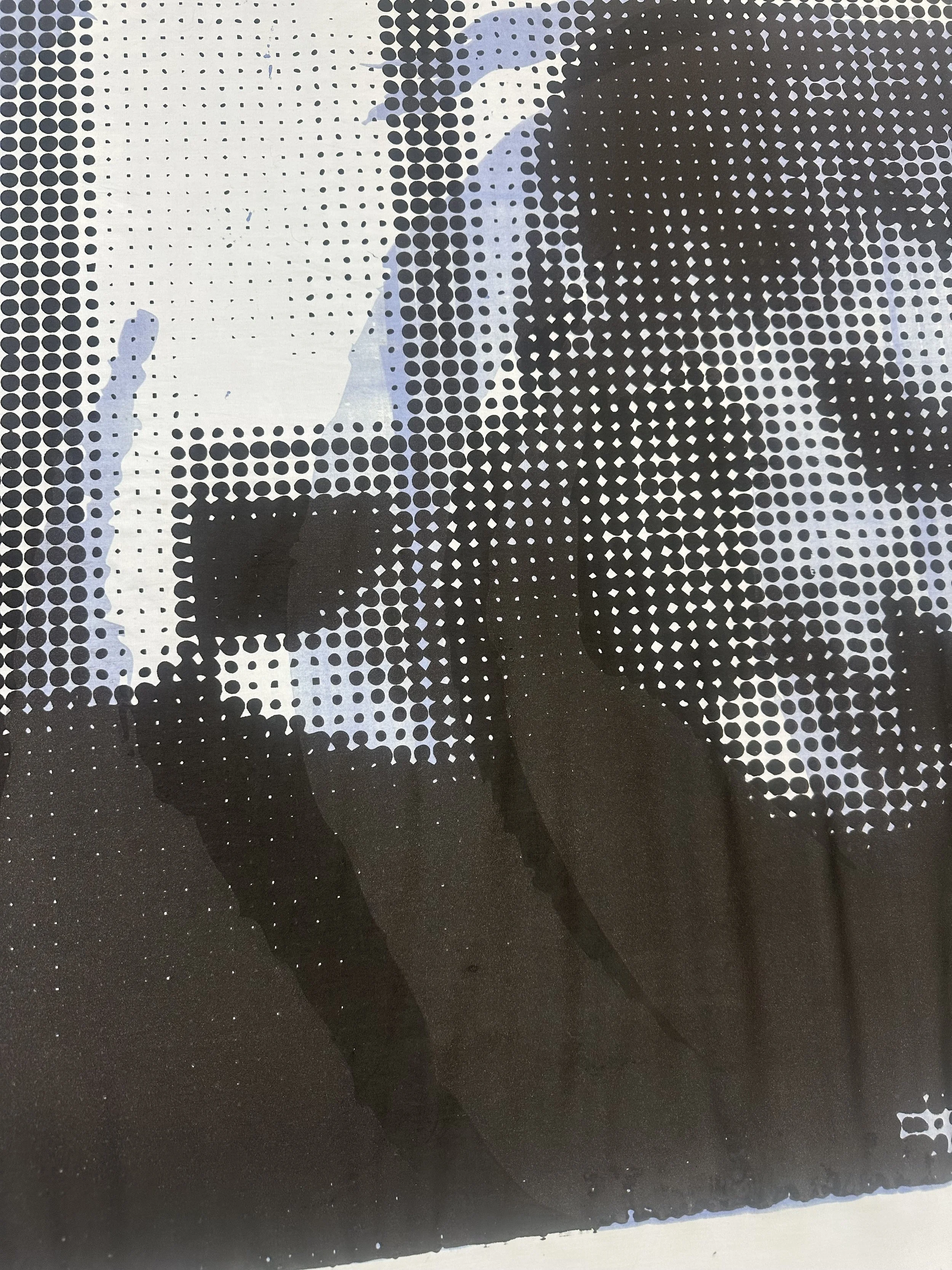 An ode to my grandfather, this piece reflects themes of silence and comfort. I dyed a white cotton canvas and used various printing techniques to develop the layered composition. The monochromatic blues provoke calmness while the halftone print exposes a painful truth about Alzheimer-ridden patients.